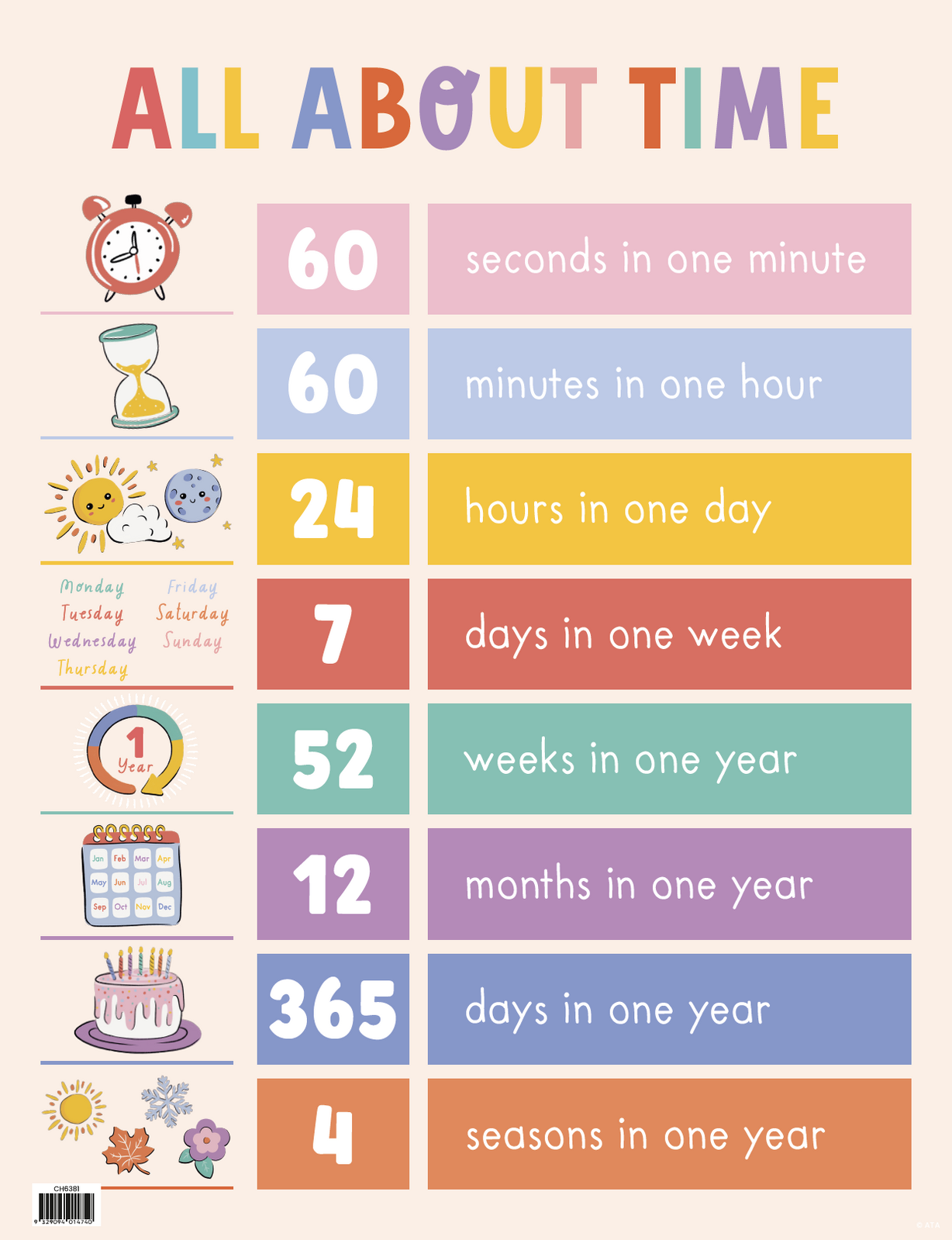 This colourful All About Time Chart acts as a fantastic reference guide for young children, as well as brightening up classroom walls.