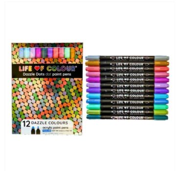 • Set of 12 dot paint pens in bright, bold colours – multiple shades of pink, blue, green, orange and red